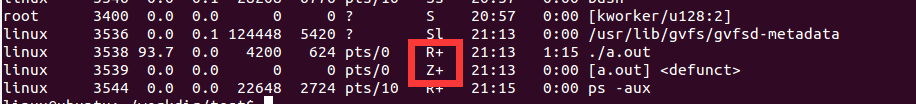 此時父進程3538狀(zhuang)態為(wei)R+而子進程狀(zhuang)態為(wei)Z+,通過查(cha)看ps命(ming)令文檔可的(de)如下說明(ming):