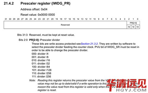 遞減計數器的時鐘由 LSI經過一個 8位的預分頻器得到,我們可以操作預分頻器寄存器 IWDG_PR 來設置分頻因子,分頻因子可以是:[4,8,16,32,64,128,256,256],計數器時鐘CK_CNT= 40/ 4*2^PRV,一個計數器時鐘計數器就減一。