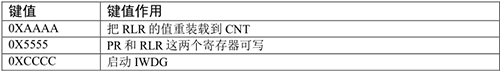 鍵值寄存器 IWDG_KR 可以說是獨立看門狗的一個控制寄存器,主要有三種控制方式,往這個寄存器寫入下面三個不同的值有不同的效果。
