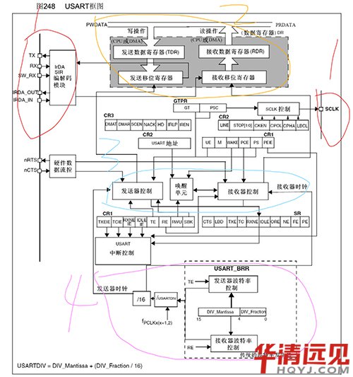USART有專門控制發送的發送器、控制接收的接收器,還有喚醒單元、中斷控制等。