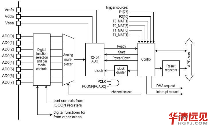 (1)10 位或 12 位 CMOS 模數轉換器(ADC)由4通道模擬輸入組成。它利用 5MHz A/D 轉換器時鐘以最大 1MSPS 的轉換速率將模擬輸入信號轉換為 10 位或 12 位二進制數字代碼。A/D 轉換器采用片上 sample-and-hold 功能。ADC 支持低功耗模式.