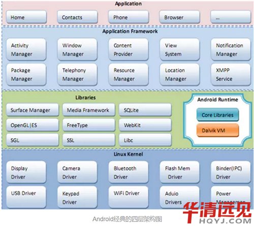 安卓系統,底層使用的是linux系統.在linux應用層至上實現了java環境和安卓系統需要的各種庫 組件等.下圖是安卓系統的框架: