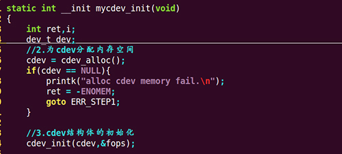 然后由我們的模塊入口函數指定的函數來調用上面這個函數,也就是我們的mycdev_init函數,里面完成了為cdev分配空間、設備號的申請、字符設備驅動的注冊等: