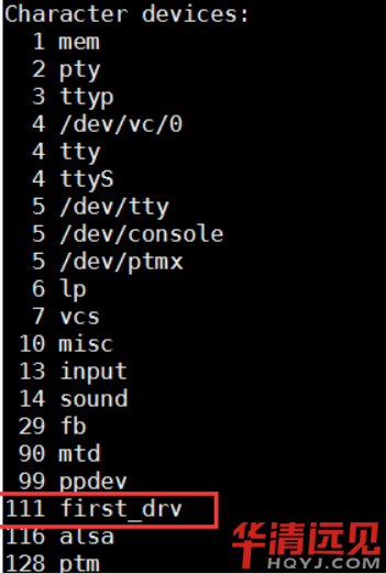 然后通過cat /proc/devices就可以查看我們添加的設備文件,