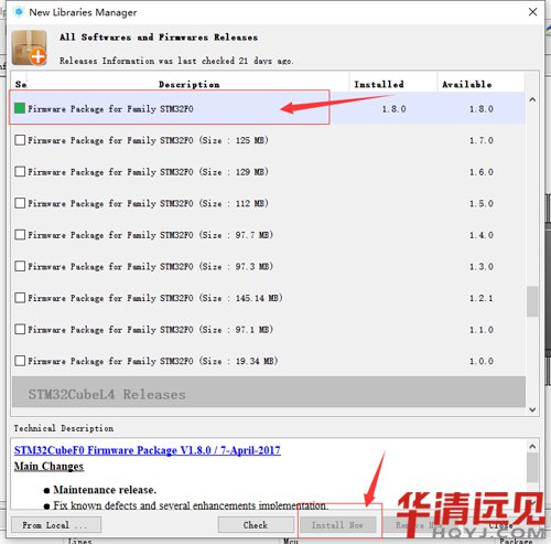 6、勾選stm32f0 ,然后單擊Install Now, 下載完成之后,方框就會變綠色,表示成功
