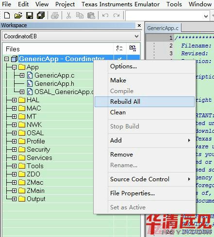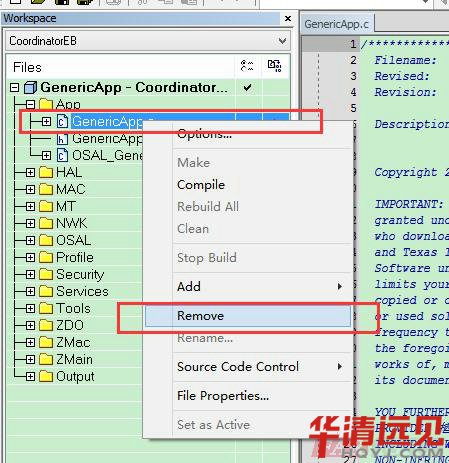 刪(shan)除(chu)工(gong)程中(zhong)的(de)GenericApp.C 文件,刪(shan)除(chu)方(fang)法是:先選擇要刪(shan)除(chu)的(de)文件,右鍵在(zai)彈(dan)出的(de)下拉菜(cai)單中(zhong)選擇Remove 即可,如下