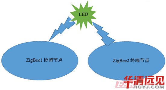 數(shu)據(ju)傳輸實(shi)驗的(de)基本功能:兩個(ge)ZigBee節點(dian)進行點(dian)對點(dian)通(tong)信,ZigBee終端節點(dian)2發(fa)送"LED"三個(ge)字符,ZigBee協調(diao)節點(dian)收到(dao)數(shu)據(ju)后,對接(jie)收到(dao)的(de)數(shu)據(ju)進行判斷,如果收到(dao)的(de)數(shu)據(ju)是"LED",則使開(kai)發(fa)板上的(de)LED燈(deng)閃(shan)爍(1S閃(shan)爍一(yi)次)。數(shu)據(ju)傳輸實(shi)驗原(yuan)理圖如圖下所(suo)示。無線控制終端節點(dian)燈(deng),一(yi)秒鐘閃(shan)亮一(yi)次。