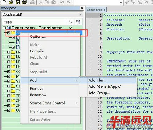 在工(gong)(gong)程工(gong)(gong)程中添(tian)加(jia)兩個(ge)文(wen)件(jian)Coordinator.c和EndDevice.c。添(tian)加(jia)如下:先在C:\Texas Instruments\ZStack-CC2530-2.3.0-1.4.0\Projects\zstack\Samples\GenericApp\Source文(wen)件(jian)夾中新建上面兩個(ge).c文(wen)件(jian)。然(ran)后添(tian)加(jia)你(ni)剛才新建的文(wen)件(jian)(EndDevice.c和Coordinator.c)。