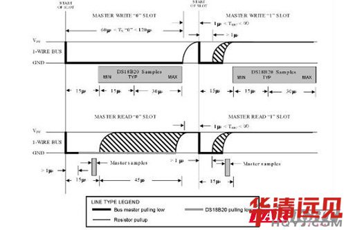 如文(wen)檔所述,所有(you)(you)的寫時隙(xi)(xi)必(bi)須至(zhi)少有(you)(you)60us的持續時間(jian)。相鄰兩個(ge)寫時隙(xi)(xi)必(bi)須要有(you)(you)少1us的恢復時間(jian)。所有(you)(you)的寫時隙(xi)(xi)(寫0和寫1)都由拉低總線產生。