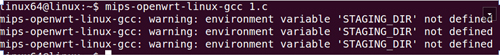 可(ke)以(yi)看到(dao)上(shang)(shang)面的(de)警告說(shuo)是找不到(dao)STAING_DIR,這個環境變量(liang) 只需要在/etc/bash.bashrc 文件中(zhong)添加上(shang)(shang)這句即可(ke)
