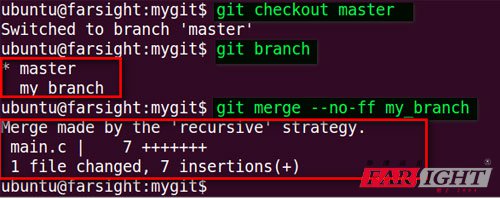 操作效(xiao)果如下,合并(bing)(bing)之后(hou)(hou)有相應的(de)提示(shi), --no-ff參數表示(shi)可以用普通(tong)模式(shi)合并(bing)(bing),合并(bing)(bing)后(hou)(hou)的(de)歷史(shi)有分支,能看出來(lai)曾(ceng)經做過合并(bing)(bing),而(er)fast forward合并(bing)(bing)就看不(bu)出來(lai)曾(ceng)經做過合并(bing)(bing)。