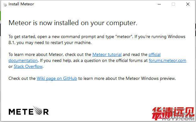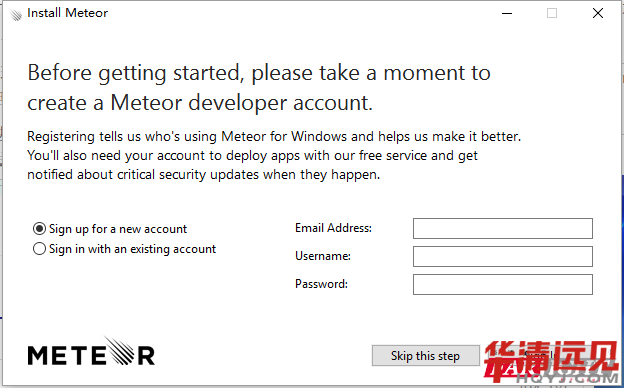 如果在安裝(zhuang)過程(cheng)中發生任(ren)何(he)錯誤(wu),可以(yi)(yi)嘗試以(yi)(yi)管理員身份運行安裝(zhuang)程(cheng)序。當安裝(zhuang)完成后(hou),它會要求你創建 Meteor 帳戶(hu)。