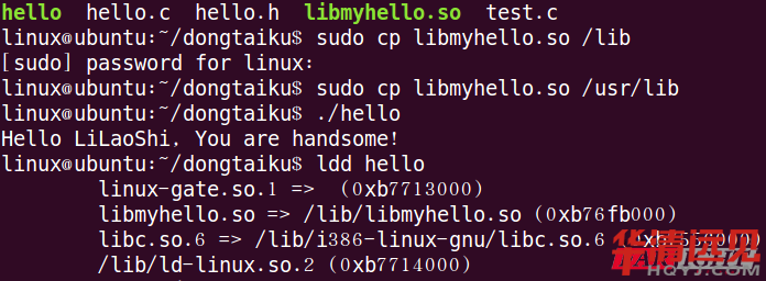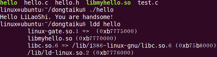 此時就生(sheng)成了文件名為(wei)libmyhello.so(庫(ku)名為(wei)myhello)的動態(tai)庫(ku)。下一步就可以將該動態(tai)庫(ku)鏈接(jie)到程(cheng)序中了。