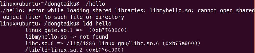 我們可以使用ldd指(zhi)令查看程序(xu)加載(zai)(zai)庫的(de)情況。在(zai)執行hello程序(xu)的(de)時候,系統無(wu)法找到libmyhello.so的(de)絕(jue)對路徑(jing),因此(ci)無(wu)法加載(zai)(zai)庫。