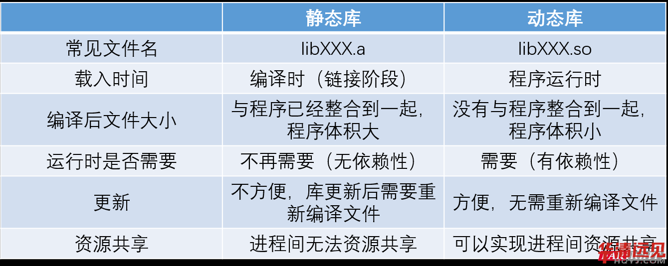 (注(zhu)意:在(zai)Linux系(xi)統中(zhong),庫(ku)文(wen)(wen)件(jian)的文(wen)(wen)件(jian)名一般為libXXX.a或libXXX.so,其中(zhong)lib表示(shi)這是一個庫(ku),.a表示(shi)靜態(tai)(tai)庫(ku),.so表示(shi)動(dong)態(tai)(tai)庫(ku),XXX為庫(ku)名。在(zai) Windows系(xi)統中(zhong)以不同的文(wen)(wen)件(jian)后綴名區分(fen)靜態(tai)(tai)庫(ku)與動(dong)態(tai)(tai)庫(ku),其中(zhong).lib文(wen)(wen)件(jian)為靜態(tai)(tai)庫(ku),.dll文(wen)(wen)件(jian)為動(dong)態(tai)(tai)庫(ku)。)
