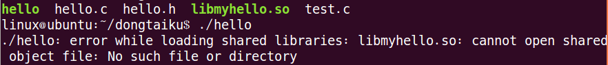 錯誤信息為(wei)“當加載共享(xiang)庫的(de)時候,無法找(zhao)到(dao)libmyhello.so的(de)位置:沒有該文件或目錄”。