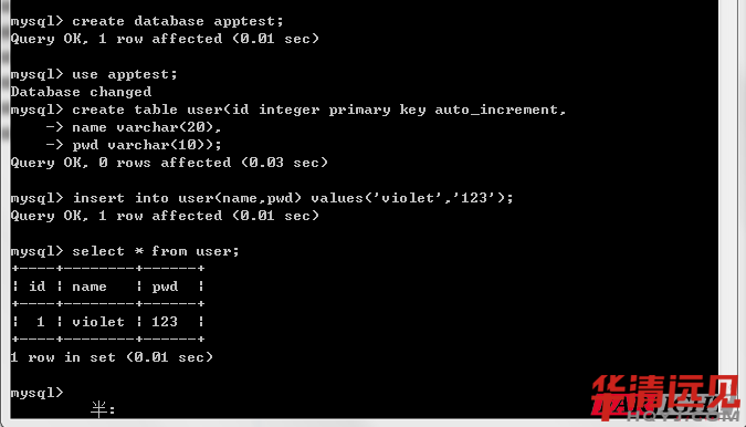 3) 創(chuang)建(jian)user表(biao)(biao)(biao),由于第二步使(shi)用了(le)apptest數據庫,那么(me)user表(biao)(biao)(biao)將在apptest數據庫中創(chuang)建(jian)。輸入建(jian)表(biao)(biao)(biao)命令如下: