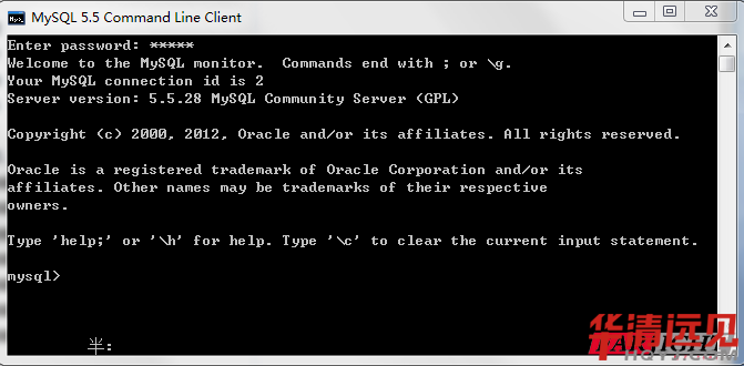 本文(wen)(wen)安(an)裝mysql 5.5版本(安(an)裝軟件mysql-5.5.28-winx64.msi,本文(wen)(wen)不再細述安(an)裝過(guo)程),安(an)裝后啟動MySQL5.5 Command Line Client,輸入安(an)裝時密碼,進(jin)入到mysql控(kong)制臺,如下圖所示: