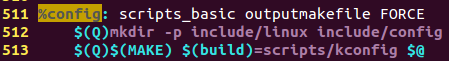 大家可能有(you)疑問(wen),這(zhe)個界面是(shi)通過什么(me)來生成的(de)呢(ni)?其(qi)實也(ye)很容易會知道,當(dang)我們執行make menuconfig后,肯(ken)定會執行Makefile,那么(me)我們打開Makefile文件來尋找menuconfig這(zhe)個目標,但是(shi)是(shi)搜索不(bu)到的(de),這(zhe)里(li)有(you)個技(ji)巧(qiao),我們使用%config來搜索,%是(shi)通配(pei)符的(de)意思,會搜索到相關目標: