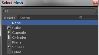 和上述(shu)步驟一樣,Add Component,選擇Mesh Renderer,返回到(dao)Scene中看(kan)到(dao)會有如(ru)此場景,選擇上面所說的(de)不(bu)(bu)同Mesh,可以看(kan)到(dao)Scene中呈(cheng)現出不(bu)(bu)同的(de)形狀。
