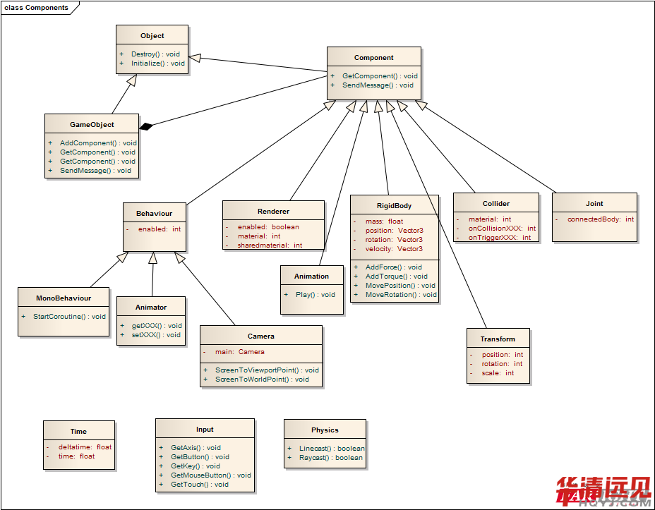 由上圖可以看出(chu)Unity中(zhong)的(de)所有類(lei)(lei)都繼(ji)承于Object,而Unity中(zhong)只分了兩(liang)個(ge)種類(lei)(lei),一個(ge)是(shi)GameObject和(he)一個(ge)Component,而Component的(de)派(pai)生類(lei)(lei)包含(han)了Unity中(zhong)所有類(lei)(lei),Unity3D面向組件編(bian)程的(de)思想略見一斑。