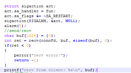 但(dan)要(yao)注意:在(zai)安裝信號的(de)時候,不能使用(yong)signal函數,因為signal默認會繼續執行(xing)系統調用(yong),也(ye)就是說(shuo)當時間到了(le)以(yi)后,又繼續執行(xing)recv函數了(le),還是會繼續阻塞,沒有達到我(wo)們想要(yao)的(de)效果,所以(yi)這(zhe)個時候我(wo)們就要(yao)使用(yong)比它(ta)功能更強大的(de)sigaction了(le),如下圖: