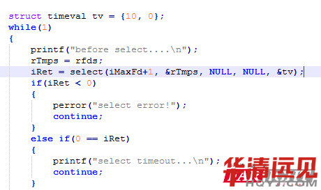 int select(int n, fd_set *read_fds, fd_set *write_fds, fd_set *except_fds, struct timeval *timeout);這(zhe)是(shi)select函數(shu)(shu)的(de)原型,后(hou)一(yi)個參(can)數(shu)(shu),就(jiu)是(shi)用來(lai)設(she)置超(chao)(chao)時(shi)的(de),如果后(hou)一(yi)個參(can)數(shu)(shu)為NULL的(de)話,也就(jiu)是(shi)沒有超(chao)(chao)時(shi)檢(jian)(jian)測,那(nei)么select監控的(de)文件描(miao)述符(fu)(fu)都沒有準備好(hao),select就(jiu)會(hui)一(yi)直阻塞,直到有準備好(hao)的(de)文件描(miao)述符(fu)(fu),如要(yao)需(xu)要(yao)超(chao)(chao)時(shi)檢(jian)(jian)測,后(hou)一(yi)個參(can)數(shu)(shu)就(jiu)是(shi)要(yao)設(she)置的(de)超(chao)(chao)時(shi)時(shi)間,一(yi)旦超(chao)(chao)時(shi),此(ci)時(shi)select就(jiu)會(hui)返回0,表示沒有準備好(hao)的(de)文件描(miao)述符(fu)(fu),代碼可參(can)考下圖: