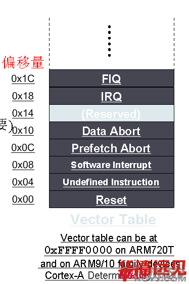 呵呵,在這里我(wo)們需要重點研究的(de)是(shi),異常(chang)產生后,后PC會指到(dao)哪里去呢?這個事情(qing)實際(ji)不需要我(wo)們操(cao)心,ARM核在設計(ji)的(de)時候就(jiu)已經確定好了,也就(jiu)是(shi)經常(chang)我(wo)們所說的(de)異常(chang)向量(liang)表。異常(chang)向量(liang)表: