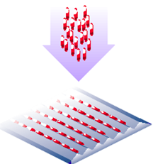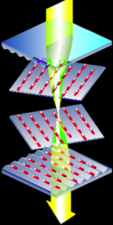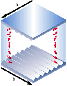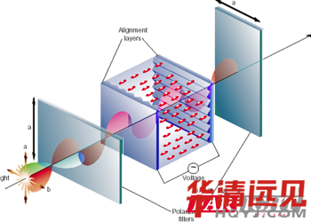 b、液晶的(de)垂直分(fen)(fen)布:當液晶被包含到兩個(ge)槽狀表面(mian)中(zhong)間,且槽的(de)方向互相垂直,則液晶分(fen)(fen)子(zi)(zi)(zi)的(de)排列為,上表面(mian)分(fen)(fen)子(zi)(zi)(zi)沿(yan)著(zhu)a方向;下表面(mian)分(fen)(fen)子(zi)(zi)(zi)沿(yan)著(zhu)b方向;介于上下表面(mian)的(de)分(fen)(fen)子(zi)(zi)(zi)產(chan)生旋(xuan)轉(zhuan)效應,因此液晶分(fen)(fen)子(zi)(zi)(zi)在兩個(ge)表面(mian)間產(chan)生90度旋(xuan)轉(zhuan)。