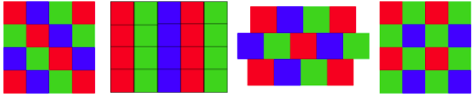 b、彩色濾光片(pian)像素(su)矩陣的(de)排列方式如下,分別(bie)為馬賽克、直(zhi)條式、三角(jiao)形式、四(si)化(hua)素(su)