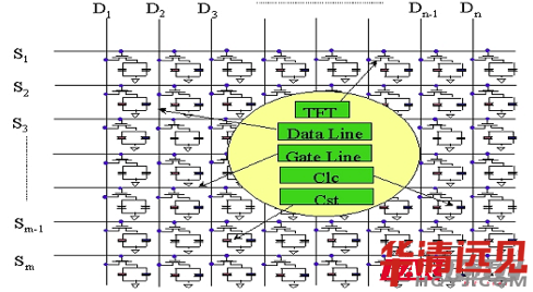 彩色單(dan)(dan)元(yuan)對應到TFT的控制單(dan)(dan)元(yuan),就可以完成(cheng)我們(men)像素點的顏色控制。TFT矩(ju)陣等效電路如(ru)下:
