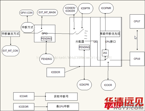 上述第2章是對異常處理以及返回的主要內容,那么我們來想象下,這些都是在假設中斷初始化的基礎之上實現的,那么中斷初始化都初始化了那些內容呢?這就需要我們對中斷有一個基本的認識:對于一個處理器芯片來說,他只認識兩種外部中斷:快速訪問中斷和外部中斷,這兩者的區別只是中斷優先級的高低,但是實際上中斷有多個,CPU核也有多個,CPU怎么區分外部中斷哪是哪、這些中斷給那個CPU核來處理,中斷的優先級又是什么,這些都是要有人來完成,而完成這個工作的就是中斷控制器。