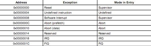 正是(shi)由于(yu)異(yi)(yi)常(chang)向量(liang)表(biao)的(de)存(cun)(cun)在(zai)(zai),才讓硬件(jian)異(yi)(yi)常(chang)處理(li)(li)和程序員自(zi)定義處理(li)(li)程序有機聯(lian)系起來(lai)。異(yi)(yi)常(chang)向量(liang)表(biao)里0x00000000地址(zhi)處是(shi)reset復(fu)位(wei)異(yi)(yi)常(chang),之(zhi)所以(yi)它(ta)(ta)為0地址(zhi),是(shi)因為CPU在(zai)(zai)上電時(shi)(shi)自(zi)動從0地址(zhi)處加載指令(ling),由此可(ke)(ke)見(jian)將(jiang)復(fu)位(wei)異(yi)(yi)常(chang)安(an)裝(zhuang)(zhuang)在(zai)(zai)此地址(zhi)處也(ye)是(shi)前后(hou)(hou)接合起來(lai)設計(ji)的(de),不(bu)得(de)不(bu)感嘆CPU設計(ji)師的(de)偉大(da)(da),其(qi)(qi)后(hou)(hou)面分別(bie)是(shi)其(qi)(qi)余7種(zhong)異(yi)(yi)常(chang)向量(liang),每種(zhong)異(yi)(yi)常(chang)向量(liang)都占(zhan)有四個(ge)字節(jie)(jie),正好是(shi)一(yi)(yi)(yi)條(tiao)指令(ling)的(de)大(da)(da)小,后(hou)(hou)一(yi)(yi)(yi)個(ge)異(yi)(yi)常(chang)是(shi)快(kuai)速(su)中斷異(yi)(yi)常(chang),將(jiang)其(qi)(qi)安(an)裝(zhuang)(zhuang)在(zai)(zai)此也(ye)有它(ta)(ta)的(de)意義,在(zai)(zai)0x0000001C地址(zhi)處可(ke)(ke)以(yi)直接存(cun)(cun)放(fang)快(kuai)速(su)中斷的(de)處理(li)(li)程序,不(bu)用設置跳轉指令(ling),這(zhe)樣可(ke)(ke)以(yi)節(jie)(jie)省一(yi)(yi)(yi)個(ge)時(shi)(shi)鐘(zhong)周期,加快(kuai)快(kuai)速(su)中斷處理(li)(li)時(shi)(shi)間。