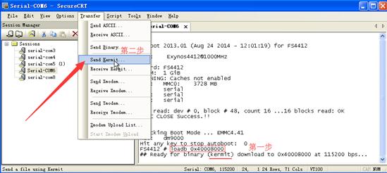 然(ran)后在(zai)串口工(gong)具上選擇(ze)transfer菜單里的send kermit選項(xiang)