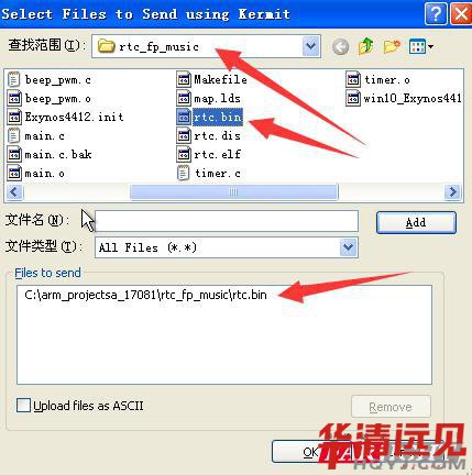 選擇文件工程(cheng)中編譯生成的(de) .bin文件;并添加到files to send 列表;然后點擊(ji)OK