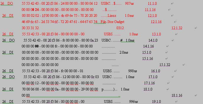 注意上面紅色部分的代碼,DO發出了55 53 42 43開始的CBW命令塊,命令碼是12,即Inquiry命令。要求目標返回Inquiry命令要求的數據,長度是0x24。接下來設備端通過DI返回了設備信息。按照規范,在返回完了數據后,設備端還應該通過DI向系統返回CSW的值。但實際的捕獲內容并沒有。所以導致不能正確出現盤符。