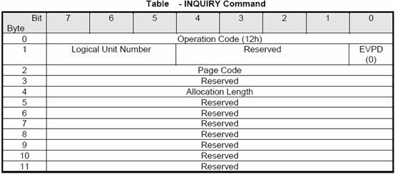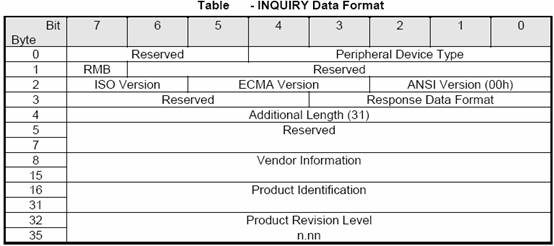 對于不同的命令,其命令塊描述符略有不同,其要求的返回內容也有所不同,根據相 應的文檔,可以對每種請求作出適當的回應。比如,下面是INQUIRY 請求的命令塊描述符和其返回內容的數據格式:如:INQUIRY