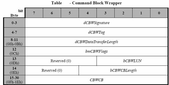 下面看看Bulk-Only 傳輸協議:(詳細的規范請閱讀《Universal Serial BusMass Storage ClassBulk-Only Transport》)
