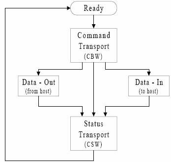 在(zai)這種傳(chuan)輸方式下,有三種類型的(de)(de)(de)數(shu)據(ju)在(zai)USB 和設備(bei)之(zhi)間傳(chuan)送,CBW、CSW 和普(pu)通數(shu)據(ju)。CBW(Command Block Wrapper,即命(ming)令(ling)(ling)塊包)是(shi)從USB Host 發(fa)送到設備(bei)的(de)(de)(de)命(ming)令(ling)(ling), 命(ming)令(ling)(ling)格式遵從接口中的(de)(de)(de)bInterfaceSubClass 所指定的(de)(de)(de)命(ming)令(ling)(ling)塊,這里為SCSI 傳(chuan)輸命(ming)令(ling)(ling)集。USB設備(bei)需要(yao)將SCSI 命(ming)令(ling)(ling)從CBW 中提(ti)取(qu)出來(lai),執(zhi)行相(xiang)應的(de)(de)(de)命(ming)令(ling)(ling),完成以后,向Host 發(fa)出反映(ying) 當前(qian)命(ming)令(ling)(ling)執(zhi)行狀態(tai)的(de)(de)(de)CSW(Command Status Wrapper),Host 根據(ju)CSW 來(lai)決定是(shi)否繼續(xu)發(fa) 送下一個CBW 或是(shi)數(shu)據(ju)。Host 要(yao)求USB 設備(bei)執(zhi)行的(de)(de)(de)命(ming)令(ling)(ling)可(ke)能(neng)為發(fa)送數(shu)據(ju),則此時需要(yao)將 特(te)定數(shu)據(ju)傳(chuan)送出去,完畢后發(fa)出CSW,以使Host 進行下一步(bu)的(de)(de)(de)操作(zuo)。USB 設備(bei)所執(zhi)行的(de)(de)(de)操