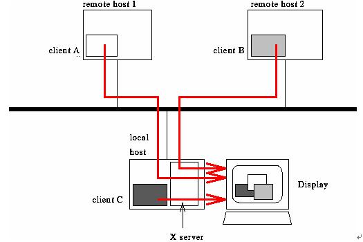 我們可以在自己的計算機上激活 X-Server后,再 Telnet 聯機至其它計算機,將其它計算機上 X-Client的執行結果傳回到自己的屏幕上。當然 X-Server 一定得在使用者自己的計算機上執行,這樣我們才能看到應用程序 (X-Clients) 的執行結果為何。