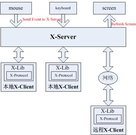 當用戶點擊鼠標或者按下鍵盤的時候這些動作會傳遞給X-Server,X-Server把這些動作以事件的形式傳遞給X-Client,X-Client根據具體的事件執行相應的程序,再將所要顯示的結果傳給X-Server,X-Server將結果顯示在屏幕上