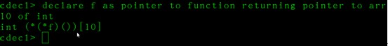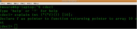 可(ke)以看到,cdecl為我們解釋(shi)了int (*(*f)()) [10]這個(ge)聲明的(de)含義,有了這個(ge)工具,不管我們遇到怎樣(yang)詭(gui)異的(de)C語言(yan)聲明,都可(ke)以從容應對了吧,呵(he)呵(he)! 當(dang)然,我們可(ke)以(yi)給cdecl一個聲明的(de)語(yu)法(fa),把上面一段解釋輸入(ru)進去(qu),就可(ke)以(yi)看(kan)到: