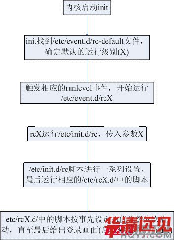 這是(shi)(shi)我們熟知的(de)(de)(de)(de)linux啟(qi)動(dong)流(liu)(liu)程(cheng),但是(shi)(shi)ubuntu的(de)(de)(de)(de)啟(qi)動(dong)流(liu)(liu)程(cheng)和這個(ge)有(you)些(xie)區別,我在(zai)ubuntu的(de)(de)(de)(de)/etc/目(mu)錄(lu)下面找不(bu)到(dao)(dao)inittab這個(ge)文件,一開始(shi)很納悶ubuntu是(shi)(shi)怎么啟(qi)動(dong)的(de)(de)(de)(de)?一查資(zi)料發現ubuntu并沒(mei)有(you)采用(yong)(yong)init的(de)(de)(de)(de)方法,所(suo)以在(zai)/etc/目(mu)錄(lu)下面找不(bu)到(dao)(dao)inittab,這主要是(shi)(shi)因(yin)為(wei)init采用(yong)(yong)串(chuan)行(xing)的(de)(de)(de)(de)方式(shi),引導很費時,RedHat9啟(qi)動(dong)時串(chuan)行(xing)執(zhi)行(xing)大(da)(da)量(liang)腳本(ben)以及啟(qi)動(dong)各種需要的(de)(de)(de)(de)服(fu)務,因(yin)此從ubuntu6.10開始(shi)逐(zhu)步采用(yong)(yong)upstart來(lai)代替init,進(jin)行(xing)服(fu)務進(jin)程(cheng)的(de)(de)(de)(de)管(guan)理。為(wei)了對原(yuan)有(you)的(de)(de)(de)(de)init實現向后(hou)兼容,upstart可以說是(shi)(shi)在(zai)表(biao)象上保留了大(da)(da)部分(fen)原(yuan)來(lai)init的(de)(de)(de)(de)特性,因(yin)此目(mu)前(qian)ubuntu初始(shi)化進(jin)程(cheng)名(ming)仍然(ran)叫init,而改變的(de)(de)(de)(de)核心,則是(shi)(shi)Event機制。 Event機(ji)制就是將進程(cheng)的(de)觸發(fa)、停(ting)止(zhi)都(dou)看成(cheng)是Event。Ubuntu的(de)/etc/下有一個(ge)event.d,這(zhe)個(ge)目錄是upstart的(de)核心。/etc/event.d/下面存放了目前upstart需要識別的(de)各種(zhong)(zhong)event。這(zhe)其中主要有三種(zhong)(zhong):rc-default,rcX(X = 0,1,2,3,4,5,6,S),ttyX(X = 0,1,2,3,4,5,6,S)。 其(qi)中rc-default就類似與inittab文件,用來(lai)設置默認運(yun)行級別的。cat rc-default,我們可以(yi)看到: