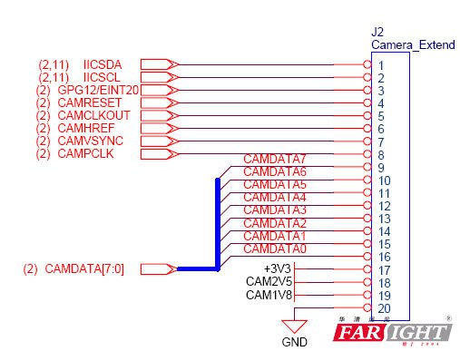 上(shang)圖中D[9:2]用(yong)于(yu)8-bitYUV或者RGB565/RGB555(D[9]MSB、D[2]LSB)。D[9:0]用(yong)于(yu)10-bit RGB。本例中使用(yong)8-bit YUV模式。 我手邊(bian)開發板(ban)的(de)(de)Camera和S3C2440的(de)(de)接線原理圖(tu)如下(對應camera中具(ju)體的(de)(de)信號名稱參見前文的(de)(de)驅(qu)動整體架(jia)構圖(tu))。 注:GPG12用于PWEN信號