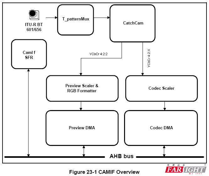 二、S3C2440 camera控制器+ov9650(ov9655) (1)S3C2440 camera控制器介紹 S3C2440支持(chi)ITU-R BT601/656格式的數字圖(tu)像輸入(ru),支持(chi)的2個通(tong)(tong)道的DMA,Preview通(tong)(tong)道和(he)Codec通(tong)(tong)道,參見下(xia)圖(tu)。