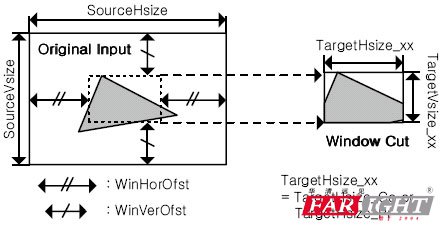 上圖(tu)中的(de)window cut功能(neng)是指在圖(tu)像(xiang)可(ke)以先做一個裁(cai)剪。通過設置(zhi)CIWDOFST完成(cheng)此(ci)功能(neng),見(jian)下圖(tu)。圖(tu)像(xiang)進(jin)入P、C通道后,各自的(de)scaler單(dan)元還(huan)可(ke)以對其進(jin)行縮放(fang)、旋(xuan)轉等處(chu)理。