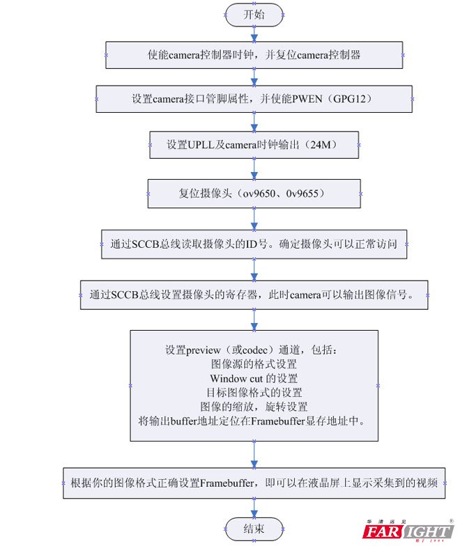 ● 3C2440 camera控制器+ov9650(ov9655) 一、 視頻驅動的(de)整體框架 視頻驅(qu)動的整體框(kuang)架見下圖(tu):