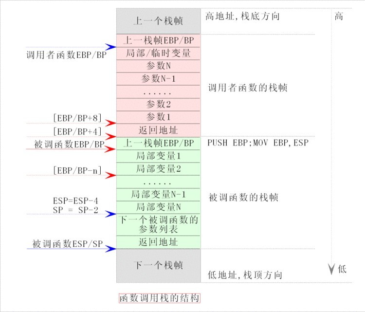 匯編/C語言中的'數據棧'跟數據結構中的'邏輯棧'類似都是遵循先進后(hou)出后(hou)進先出原則,但是在實際操作過程中的基本單(dan)位(wei)不同: 1.在數據(ju)結構(gou)中的(de)(de)'邏輯(ji)棧'按照使用者自己的(de)(de)需求定義(yi)大小及(ji)基本單位。例如可以存放(fang)10個(ge)char型(xing),也可以存放(fang)20個(ge)結構(gou)體等(deng)。 2.在(zai)匯編或C語言本(ben)身的'數(shu)據(ju)棧'中棧大(da)小由編譯器指定(ding),遵循(xun)FIFO規(gui)則的基本(ben)單位是棧幀,即每調(diao)用一個函(han)數(shu)都會(hui)有一個新的棧幀加入,而函(han)數(shu)返回則以棧幀為單位出(chu)棧。 棧幀(zhen)也(ye)叫過(guo)程活(huo)動記錄,是編譯器用(yong)來(lai)實現過(guo)程/函(han)(han)數調用(yong)的一(yi)種數據結(jie)構。其實就(jiu)是一(yi)個函(han)(han)數執行的環(huan)境:函(han)(han)數參數、函(han)(han)數的局部(bu)變量、函(han)(han)數執行完后返回到哪(na)里等等。 因此,在同一個(ge)棧(zhan)幀內(nei)數據的(de)訪問(wen)可以(yi)使隨機的(de),匯(hui)編中可以(yi)通(tong)過(guo)ebp 指針向(xiang)(xiang)上(shang)或(huo)向(xiang)(xiang)下任(ren)意偏移(yi)就可以(yi)訪問(wen)當前(qian)函數內(nei)部(bu)的(de)所有局部(bu)變量,或(huo)向(xiang)(xiang)上(shang)偏移(yi)就可以(yi)訪問(wen)調用者對當前(qian)函數的(de)傳參。(因為棧(zhan)的(de)增長空間是從高地址(zhi)到低地址(zhi)。) 下面(mian)是(shi)函數(shu)調用過(guo)程中的操作: 當(dang)發生函數調用(yong)的時候,棧空(kong)間中存放的數據是這樣的: 1、調(diao)(diao)用者(zhe)函數(shu)(shu)(shu)把被(bei)調(diao)(diao)函數(shu)(shu)(shu)所(suo)需要的(de)參數(shu)(shu)(shu)按(an)照與被(bei)調(diao)(diao)函數(shu)(shu)(shu)的(de)形參順序相反的(de)順序壓入棧中,即:從右向左依次把被(bei)調(diao)(diao)函數(shu)(shu)(shu)所(suo)需要的(de)參數(shu)(shu)(shu)壓入棧; 2、調用(yong)(yong)者函數(shu)使用(yong)(yong)call指(zhi)令(ling)調用(yong)(yong)被調函數(shu),并把call指(zhi)令(ling)的下一條指(zhi)令(ling)的地(di)址當(dang)成返回地(di)址壓(ya)入棧中(zhong)(這個壓(ya)棧操作(zuo)隱(yin)含在call指(zhi)令(ling)中(zhong)); 3、在被(bei)調(diao)函數(shu)中,被(bei)調(diao)函數(shu)會先(xian)保存調(diao)用者函數(shu)的(de)棧底(di)(di)地址(push ebp),然后再保存調(diao)用者函數(shu)的(de)棧頂地址,即(ji):當前被(bei)調(diao)函數(shu)的(de)棧底(di)(di)地址(mov ebp,esp); 4、在被(bei)調函(han)數(shu)中(zhong)(zhong),從ebp的(de)位(wei)置(zhi)處開始存(cun)放(fang)被(bei)調函(han)數(shu)中(zhong)(zhong)的(de)局部變(bian)(bian)(bian)(bian)量(liang)(liang)(liang)(liang)和臨時變(bian)(bian)(bian)(bian)量(liang)(liang)(liang)(liang),并(bing)且這(zhe)些變(bian)(bian)(bian)(bian)量(liang)(liang)(liang)(liang)的(de)地(di)址(zhi)按照(zhao)定(ding)義時的(de)順序依(yi)次減小,即:這(zhe)些變(bian)(bian)(bian)(bian)量(liang)(liang)(liang)(liang)的(de)地(di)址(zhi)是按照(zhao)棧(zhan)的(de)延(yan)伸方(fang)向排(pai)列的(de),先定(ding)義的(de)變(bian)(bian)(bian)(bian)量(liang)(liang)(liang)(liang)先入棧(zhan),后(hou)定(ding)義的(de)變(bian)(bian)(bian)(bian)量(liang)(liang)(liang)(liang)后(hou)入棧(zhan); 所以,發生函數調用時,入棧的順序為: