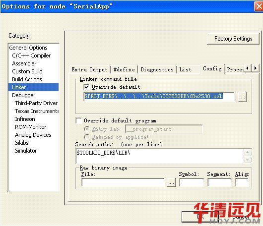 3.2 Config 標(biao)簽:設(she)置Linker command file 欄, 勾選" Override defalt", 設(she)置為"$PROJ_DIR$\..\..\..\Tools\CC2530DB\f8w2530.xcl"
