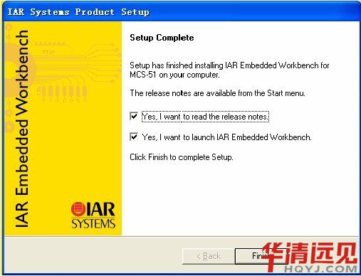 9、當進(jin)度(du)到100%時(shi),它將跳到下一個界面,如圖2.9所示。在此你可選(xuan)擇查看(kan)IAR 的介紹(shao)以及(ji)是否(fou)立(li)即運(yun)行IAR 開發集成環境。單擊"Finish"來完成安裝。